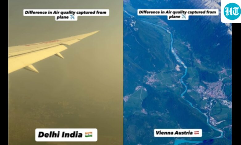 A video showing the stark difference in air quality between Vienna, Austria, and Delhi, India, from an airplane window is going viral on social media, sparking a discussion about worsening AQI in the national capital. Instagram user Lakshay Arora filmed the view while flying from Vienna to Delhi and shared side–side visuals showing a clear blue aerial view of Austria compared to a hazy, grey skyline above Delhi. The contrast between the two clips has sparked widespread reactions online.(Instagram/@indian.in.austria) “What my phone captured when I was travelling in plane from Vienna Austria to Delhi India felt like travelling from 8K resolution to blurred 90s camera quality due to high pollution,” Arora wrote in the caption of his post. The video begins with a sharp, crisp aerial shot of Vienna’s landscape, with clear skies, visible rivers and mountain ranges. The clip then transitions to an aerial shot approaching Delhi, where the aircraft is surrounded thick smog. The screen appears almost greyed out, with minimal visibility of the land or sky. The contrast between the two clips has sparked widespread reactions online. Social media users expressed concern and disappointment over Delhi’s worsening air quality. “this is truly scary and alarming! I fail to understand why are people not taking it seriously here,” one user wrote. “Populated city or not, pollution shouldn’t happen at this scale. It’s not slightly smoggy it looks like a nuke went off,” commented another. “India should really tackle this problem real time,” expressed a third user. “Reason why people are moving to Dubai.. safety..no tax..security…air quality..quality of life..high standards of living,” wrote one user. (Also Read: Ex-IAS officer who left India slams Delhi’s poor AQI: ‘I would’ve had to live and breathe in this mess’) Delhi air pollutionDelhi’s air quality typically worsens during winter due to a combination of factors such as crop stubble burning, industrial emissions, vehicular pollution and low wind speeds that trap pollutants close to the ground. According to recent air quality reports, the city’s AQI has remained in the ‘very poor’ category for several consecutive days. As the national capital remains enveloped in toxic smog, health experts have warned of rising respiratory illnesses and long-term damage. Doctors have also advised Delhiites to leave the city until pollution levels improve.
