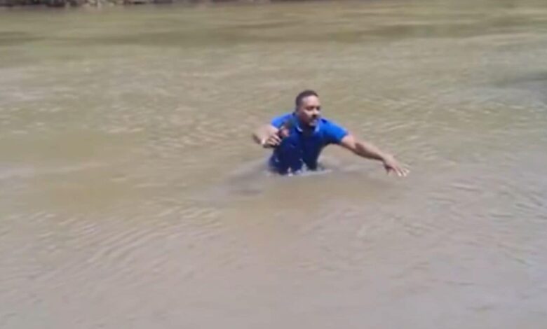 Journal Lenildo Frazão had entered the river to demonstrate its depth and the hazardous conditions present at the time of the teenager’s disappearance. While wa-deep in water, he suddenly flinched and jumped, appearing visibly shaken.