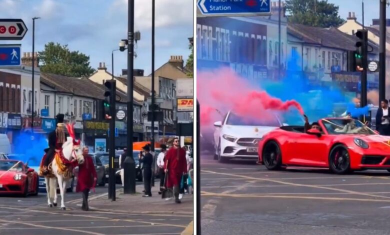 Groom rides horse, baraat follows in Ferrari and Mercedes-Benz at busy London intersection