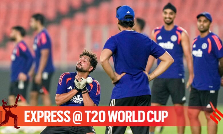 India’s Kuldeep Yadav attempts a catch during a practice session before an ICC Men’s T20 World Cup 2026 cricket match between India and South Africa, at the Narendra Modi Stadium, in Ahmedabad. (PTI Photo)