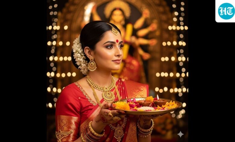 This Ashtami, social media users are turning to Google Gemini AI’s Nano Banana feature to create dazzling festive portraits that capture the true essence of Durga Puja and Navratri celebrations. From traditional ghaghra cholis and embroidered kurtas to fusion Indo-Western styles with bold jewellery and dramatic backdrops, users are transforming their selfies into professional-looking portraits with just a prompt. Visual created using the viral Google Gemini trend.(HT.com) The process is simple and only requires the Gemini app. Users can upload their photos, type in a prompt describing the festive look they want, and let the AI generate a stunning portrait. Here are some simple prompts to get that perfect festive look using Gemini AIPrompt 1: Create a 4K HD realic Durga Puja portrait. Woman wearing a red and white saree with traditional jewellery and festive makeup. The background should have diyas and a temple-style backdrop with soft golden lighting. Add subtle film grain for a cinematic effect. Prompt 2: Create a retro vintage grainy but bright image of the reference picture draped in a perfect off white saree with red border with little red prints on the saree. It must feel like a 90’s movie with straight wavy hair and windy environment. Background should have Durga maa statue in a pandal. I want same face as l uploaded no alteration. Prompt 3: 4K HD portrait of a woman in traditional saree, wearing intricate gold jewellery with a red bindi, holding a decorated plate with flowers. Background: blurred Durga Maa statue with diyas and lights. Prompt 4: Create a 4K HD portrait capturing the spirit of Durga Puja. Woman in a red and white saree with gold borders, adorned with simple jewellery. Background filled with durga puja decorations. Keep background plain, retro-textured with subtle film grain for cinematic effect. Prompt 5: Generate a cinematic Durga Puja look. Woman wearing a saree with red and gold patterns, styled hair, and festive makeup. Background should have a durga puja pandal with warm glowing lights. Add soft film grain and slight blur for realism. Prompt 6: Close-up festive portrait with golden lighting. Eyes highlighted with bold liner, glowing skin, and maang tikka. Intricate jewellery framing the face. Background softly blurred with festive decorations. Prompt 7: Joyful group photo with friends. Background: blurred Durga Maa statue with diyas and lights. Setting: crowded ground with durga puja pandal. Bright and cheerful atmosphere. Prompt 8: Create a 4K HD portrait of a woman posing in a traditional Durga Puja setting, wearing a rich red Banarasi saree with intricate gold zari work. Include matching gold jewellery. The background is a beautifully decorated Puja pandal with marigold garlands, diyas, and colourful lights. Soft golden hour lighting and cinematic close-up with festive atmosphere.